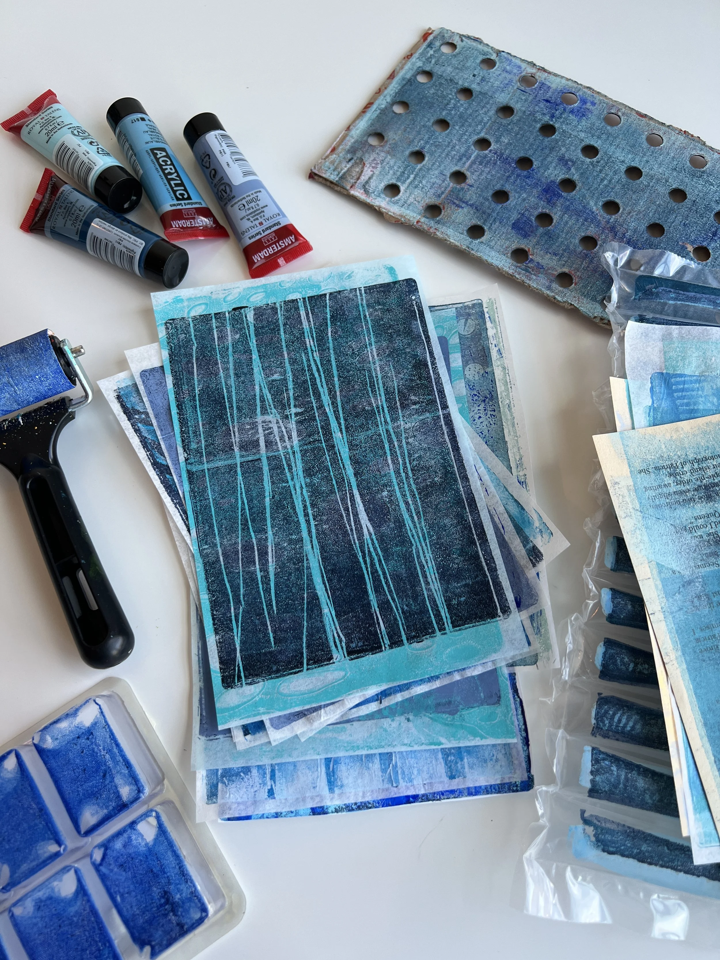 The result was a cohesive stack of blue collage papers and a reminder that creative freedom often comes from gentle constraints. This session is part of my ongoing gel plate color challenge series, where I explore one color at a time and build ready to use papers for future mixed media projects.